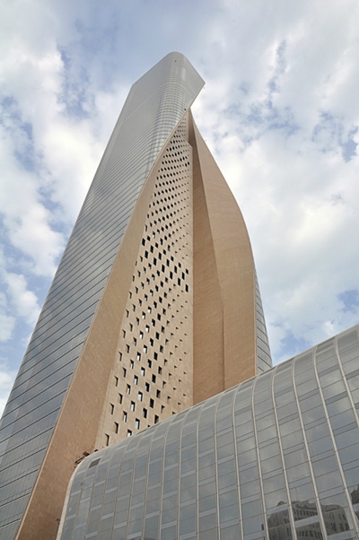 Hai bức tường chính của tòa tháp được xây chéo nhau một góc 45 độ, nối với nhau thành một hình vòng cung rộng lớn. Phần tường làm giảm sức nóng của nền nhiệt bên ngoài ở phía Nam được thiết kế với nhiều lỗ trống, giúp bảo vệ tòa nhà khỏi khí hậu khắc nghiệt vùng Trung Đông và còn đảm nhận vai trò trụ đỡ cho tòa cao ốc.