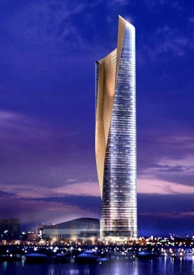 Với chiều cao lên tới gần 412m, tháp Al Hamra bao gồm 74 tầng với lối kiến trúc cuộn tròn như một tờ giấy, làm nên vẻ đẹp độc đáo cho công trình. Hơn 2.000 tấn đá vôi bao phủ bên ngoài khiến tòa nhà trở thành một trong những tòa nhà bằng đá cao nhất hành tinh.
