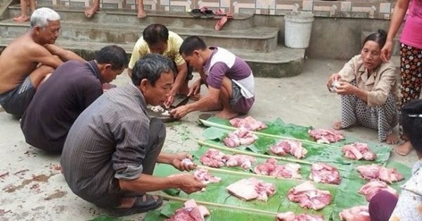 Cũng món thịt lợn thôi, nhưng chiều 30 Tết ta thèm nghe tiếng lợn kêu, được góp vài ba nhà “đụng” một con lợn hơi. Được chia đều từ lòng, thủ, thịt vai, thịt chân giò… Còn nóng hôi hổi, còn bốc khói đã bắt mắt, đã nằng nặng tay, đã xuýt xoa ơi ới, tay dao, tay thớt, nghe thật vui, thật ồn ã, náo động cả góc làng, góc xóm hồ hởi mà tươi trẻ lại. Trẻ thì được thêm cái bong bóng, già thì dành cho quả tim tươi đỏ. Chứ không lạnh ngắt, tái tê, bèo nhèo, thổng thượt như các phản thịt bán ngoài chợ.