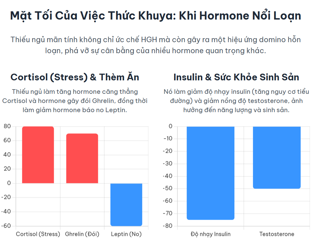 Tác hại của việc thiếu ngủ không chỉ dừng lại ở việc ức chế HGH. Nó tạo ra một “hiệu ứng domino hỗn loạn” về hormone, đẩy cơ thể vào trạng thái căng thẳng và rối loạn, dẫn đến nhiều bệnh lý nghiêm trọng.