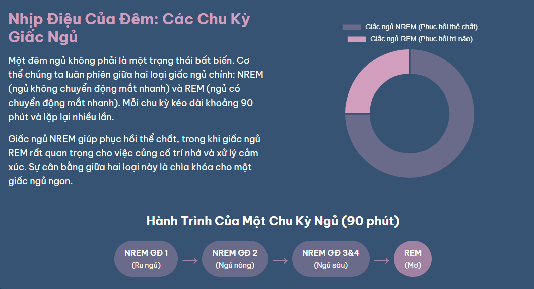 Giấc ngủ bình thường của con người được cấu thành từ hai chu kỳ chính luân phiên nhau trong suốt đêm: Non-Rapid Eye Movement (NREM) – giấc ngủ không chuyển động mắt nhanh, và Rapid Eye Movement (REM) – giấc ngủ có chuyển động mắt nhanh.3 Mỗi chu kỳ này kéo dài khoảng 90 phút và đóng vai trò riêng biệt trong quá trình phục hồi của cơ thể và não bộ.