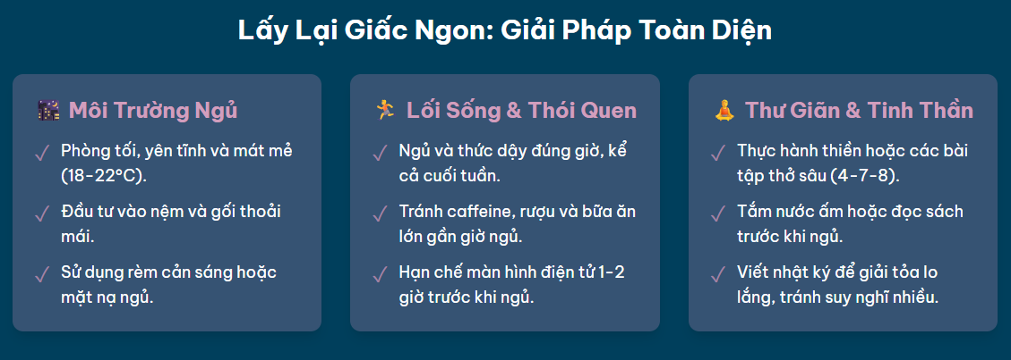 Môi trường ngủ | Ánh sáng, tiếng ồn, nhiệt độ không phù hợp | Tạo phòng ngủ tối, yên tĩnh, mát mẻ (18-22°C); dùng rèm/nút tai/máy tiếng ồn trắng |