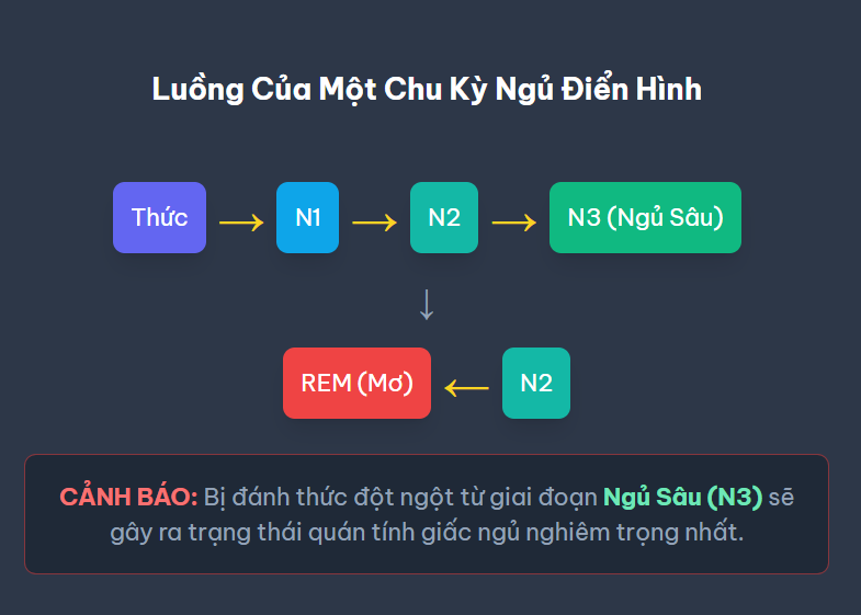 Phân tích cốt lõi: Thủ phạm chính gây ra tình trạng quán tính giấc ngủ nghiêm trọng chính là việc bị đánh thức một cách đột ngột khỏi giai đoạn ngủ sâu N3. Khi đang ở trong giấc ngủ sâu, sóng não delta hoạt động mạnh mẽ, nhịp tim, nhịp thở và huyết áp đều ở mức thấp nhất, não bộ gần như đang ở trạng thái “ngoại tuyến” để thực hiện các chức năng phục hồi. Việc bị chuông báo thức inh ỏi hoặc các tác động bên ngoài lôi ra khỏi trạng thái này một cách đột ngột sẽ khiến não bộ không có đủ thời gian để chuyển đổi một cách trơn tru sang trạng thái tỉnh táo. Điều này gây ra một cú “sốc” cho hệ thần kinh, dẫn đến cảm giác lơ mơ, mất phương hướng và mệt mỏi kéo dài.