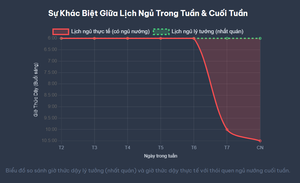 Sự chênh lệch 4 giờ thức dậy và 2 giờ đi ngủ này khiến cơ thể bạn trải qua cảm giác tương tự như vừa bay qua nhiều múi giờ khác nhau, dù bạn không hề rời khỏi nhà. Khi bạn thức dậy muộn vào sáng Chủ nhật, đồng hồ sinh học của bạn bị “đẩy lùi” về sau. Đến tối Chủ nhật, cơ thể bạn vẫn nghĩ rằng còn sớm và chưa sẵn sàng để sản xuất melatonin đi ngủ. Kết quả là bạn trằn trọc, khó ngủ, và rồi sáng thứ Hai lại phải vật lộn để ép mình dậy sớm theo lịch trình công việc, bắt đầu một tuần mới trong trạng thái mệt mỏi, uể oải và suy giảm hiệu suất.