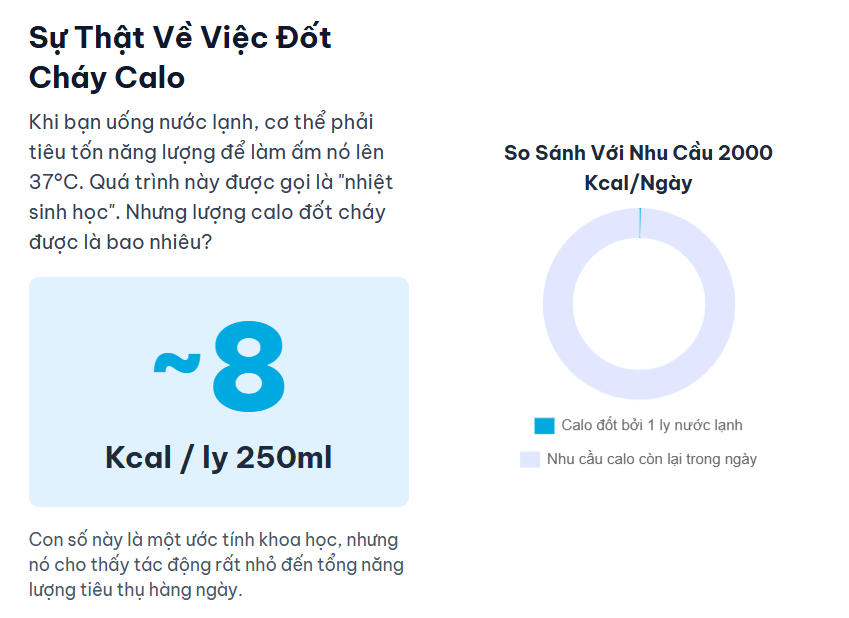 Để làm ấm 1 gram nước lên 1°C, cần khoảng 1 calo (calo vật lý). Một ly nước thông thường được ước tính chứa khoảng 250 gram nước. Nếu nước lạnh có nhiệt độ khoảng 5°C (nhiệt độ tủ lạnh) và nhiệt độ cơ thể là 37°C, thì cơ thể cần làm ấm nước lên 32°C (37°C – 5°C). Khi đó, lượng calo vật lý cần thiết sẽ là 250 gram * 32°C = 8.000 calo vật lý. Trong dinh dưỡng, 1 calo thực phẩm (kcal) tương đương với 1.000 calo vật lý. Do đó, 8.000 calo vật lý tương đương với 8 calo thực phẩm (kcal).