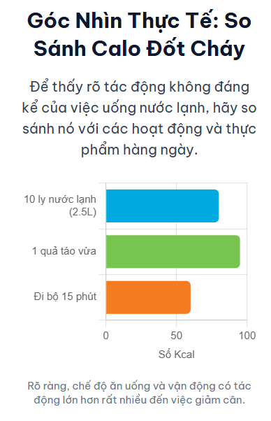 Như bảng trên cho thấy, ngay cả khi uống 10 ly nước lạnh mỗi ngày, lượng calo đốt cháy thêm trong một tháng chỉ vào khoảng 2400 calo, tương đương với việc giảm khoảng 0.3 kg mỡ. Một số nguồn khác có thể đưa ra con số cao hơn, ví dụ như 0.5 kg trong một tháng hoặc thậm chí 3 kg nếu duy trì thói quen này. Tuy nhiên, những con số lớn hơn này thường không làm rõ các yếu tố khác như chế độ ăn uống và tập luyện, vốn có ảnh hưởng lớn hơn rất nhiều đến tổng thể năng lượng tiêu hao.