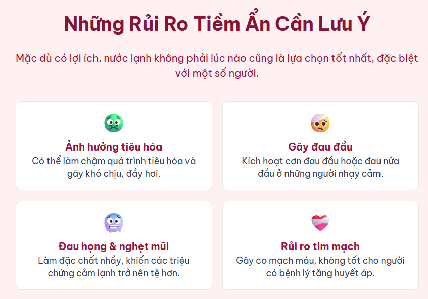 Mặc dù có những lợi ích nhất định, việc uống nước lạnh, đặc biệt là quá lạnh hoặc trong những tình huống không phù hợp, cũng có thể mang lại những tác hại hoặc gây khó chịu cho cơ thể.