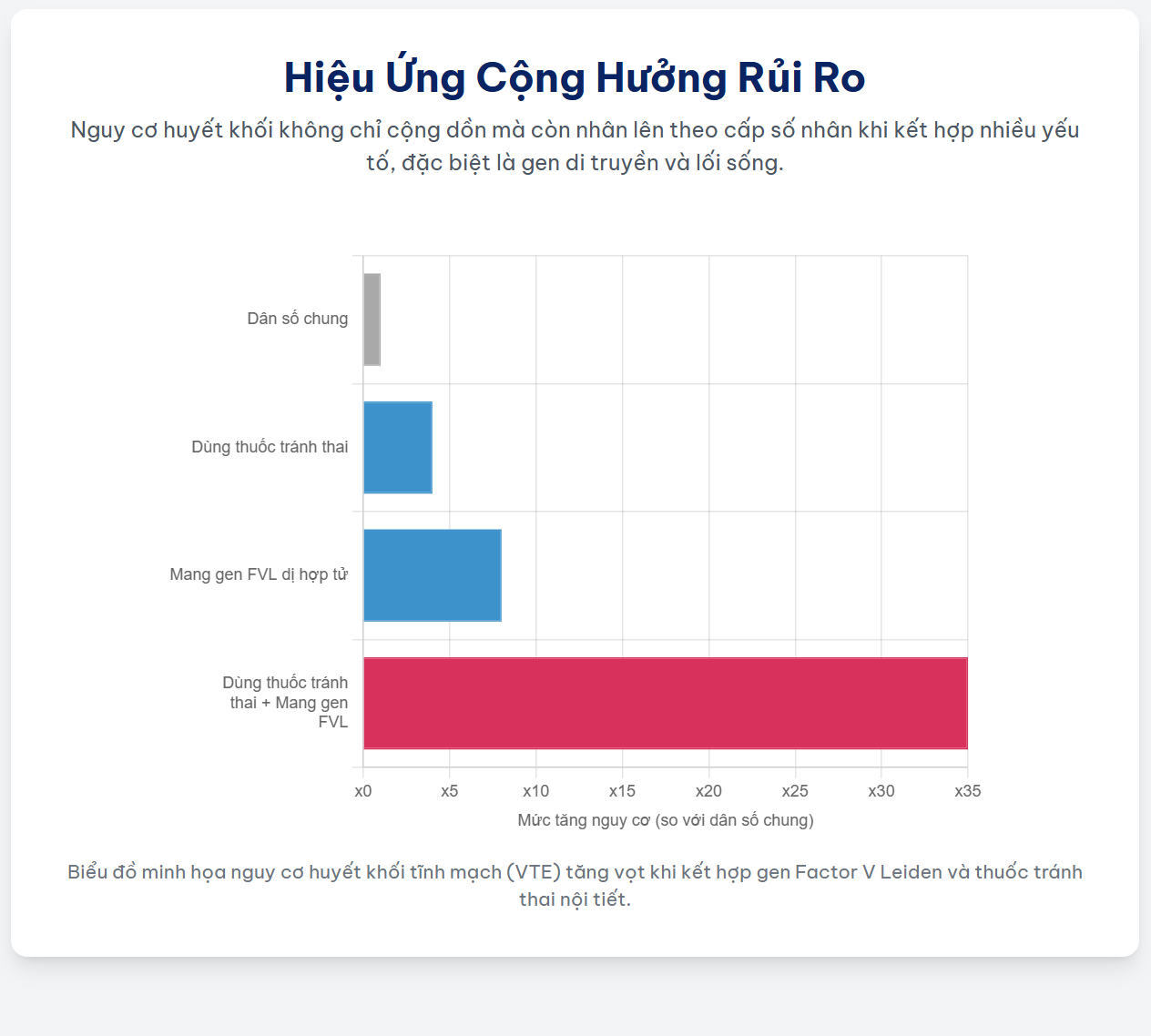 - Thuốc tránh thai và Tăng đông: Thuốc tránh thai nội tiết tố kết hợp (chứa estrogen) tự nó đã làm tăng nguy cơ huyết khối tĩnh mạch (VTE) lên khoảng 4 lần so với người không sử dụng. Một phụ nữ mang gen FVL dị hợp tử có nguy cơ cao gấp 7-8 lần. Nhưng khi hai yếu tố này kết hợp, nguy cơ không phải là 4+8=12 lần, mà có thể tăng vọt lên đến 35 lần so với người không có cả hai yếu tố nguy cơ.43