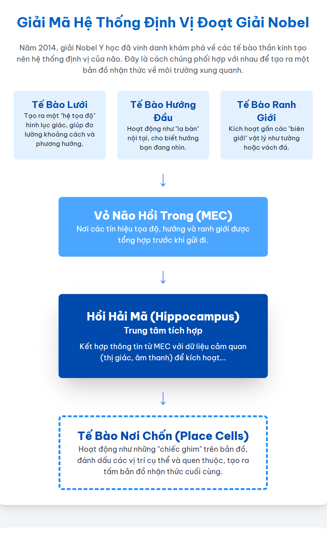 Tế bào Lưới (Grid Cell) | Vỏ não hồi trong (Medial Entorhinal Cortex) | Tạo ra một hệ tọa độ hình học để đo lường khoảng cách và phương hướng. | “Giấy kẻ ô” hình lục giác. |
