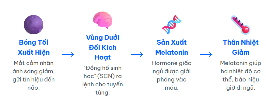 Sự sản xuất melatonin phụ thuộc vào nhịp điệu ngày đêm: lượng hormone này thường tăng lên vào buổi tối, đạt đỉnh điểm vào đêm khuya và giảm dần vào buổi sáng. Việc tiếp xúc với ánh sáng vào ban ngày sẽ ức chế quá trình tiết melatonin, giải thích tại sao chúng ta thường cảm thấy buồn ngủ vào buổi tối và giấc ngủ đêm thường dài và sâu hơn giấc ngủ ban ngày. Khi nồng độ melatonin trong cơ thể tăng lên vào ban đêm, nó đồng thời kéo theo sự giảm của cortisol (hormone gây căng thẳng), làm chậm nhịp hô hấp, mí mắt sụp dần xuống và cơ thể bắt đầu chìm vào giấc ngủ. Melatonin hoạt động như một “hormone bóng tối” chủ động, không chỉ gây buồn ngủ mà còn đồng bộ hóa cơ thể với chu kỳ ánh sáng-bóng tối để khởi tạo một giấc ngủ tự nhiên và sâu sắc.