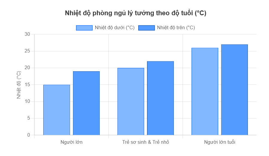 Người lớn tuổi | 26-27°C (theo khuyến nghị Việt Nam), hoặc ấm hơn 1-2°C so với người lớn | Khả năng điều hòa nhiệt độ và sản xuất hormone (melatonin, cortisol) có thể giảm theo tuổi. |