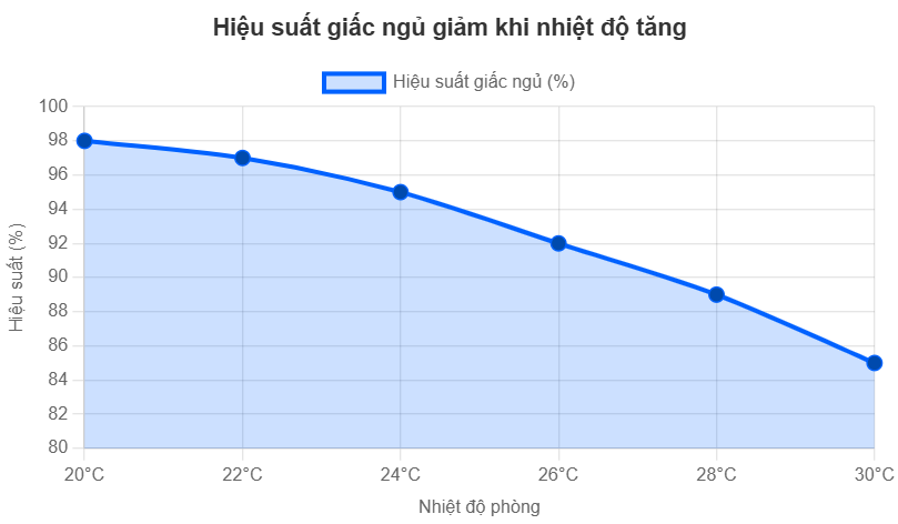 Một số người có thể tin rằng họ ngủ ngon trong một căn phòng ấm áp, nhưng các nghiên cứu khoa học chỉ ra rằng nhiệt độ mát mẻ thường mang lại lợi ích tốt hơn cho giấc ngủ sâu. Thực tế, cả nhiệt độ phòng quá cao hoặc quá thấp đều có thể gây khó ngủ, khiến bạn trằn trọc hoặc thức giấc giữa đêm, làm giảm chất lượng giấc ngủ tổng thể. Các nghiên cứu cũng chỉ ra rằng hiệu quả giấc ngủ giảm đáng kể khi nhiệt độ phòng tăng lên. Ví dụ, việc tăng 1°F nhiệt độ phòng có thể làm giảm hiệu quả giấc ngủ 0.06%.