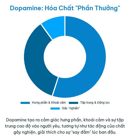 Khi một người bị thu hút bởi ai đó, não sẽ kích thích tiết ra dopamine, tạo ra cảm giác sảng khoái, hưng phấn tột độ, động lực mạnh mẽ và sự tập trung cao độ vào đối tượng được yêu. Cảm giác này được mô tả là tương tự như khi sử dụng các chất gây nghiện như cocaine hoặc rượu. Điều này giải thích tại sao tình yêu lãng mạn, đặc biệt trong giai đoạn đầu, có thể gây “nghiện” và dẫn đến những suy nghĩ ám ảnh về đối phương. Dopamine cũng liên quan đến khả năng học tập, trí nhớ và chức năng vận động, góp phần vào việc ghi nhớ những chi tiết nhỏ về người mình yêu.