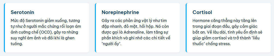 - Serotonin: Cùng với oxytocin và dopamine, serotonin thường được gọi là “bộ ba hormone hạnh phúc”. Hormone này giúp điều chỉnh tâm trạng, giấc ngủ, sự thèm ăn, tiêu hóa, khả năng học tập và trí nhớ. Một điều đáng chú ý là mức độ serotonin ở người đang yêu có thể thấp tương tự như người mắc chứng rối loạn ám ảnh cưỡng chế (OCD). Điều này có thể giải thích cho một số hành vi ghen tuông, ám ảnh và đôi khi phi lý mà người đang yêu thể hiện.