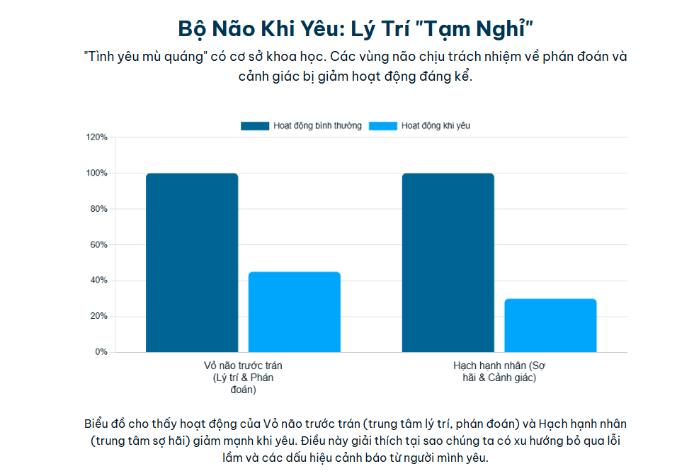 Khi một người yêu say đắm, hoạt động ở các vùng vỏ não trước trán, đặc biệt là phần liên quan đến tư duy phản biện, tự nhận thức và ra quyết định lý trí, có thể bị giảm hoặc “tắt” đi.12 Sự giảm hoạt động này cũng liên quan đến việc vô hiệu hóa các đường dẫn thần kinh xử lý cảm xúc tiêu cực như sợ hãi và phán xét xã hội.