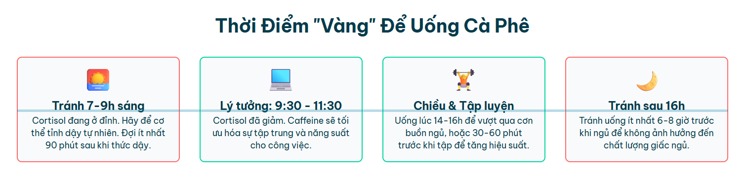 Thời điểm lý tưởng nhất để nạp caffeine là giữa buổi sáng, thường là khoảng 9h30 sáng đến 11h30 sáng, khi mức cortisol tự nhiên trong cơ thể đã bắt đầu giảm xuống.9 Vào thời điểm này, cơ thể đã tự nhiên tỉnh táo hơn, và caffeine sẽ đóng vai trò như một “liều thuốc” duy trì, giúp tận dụng tối đa lợi ích tăng cường sự tập trung và năng suất cho công việc và các hoạt động trí tuệ.16 Việc trì hoãn việc uống cà phê buổi sáng cũng có thể giúp giảm nhu cầu phải uống thêm cà phê vào buổi chiều để duy trì năng lượng, từ đó góp phần cải thiện chất lượng giấc ngủ vào ban đêm.