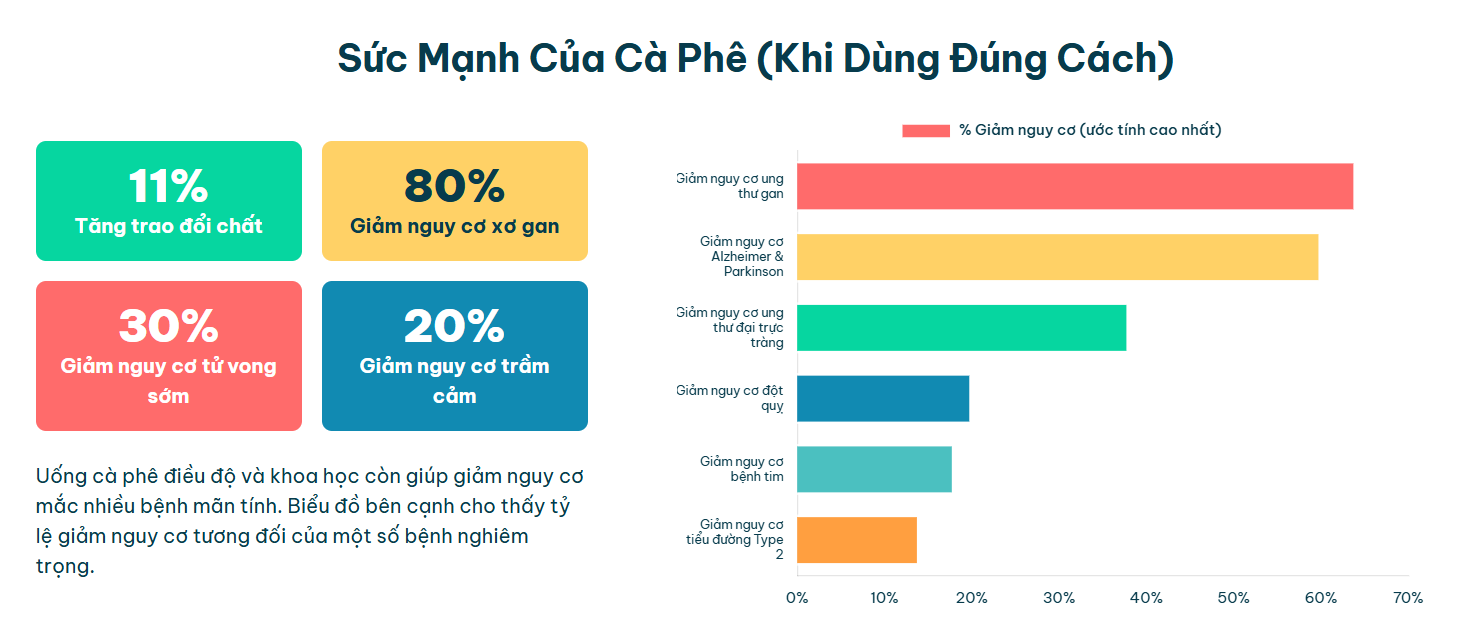 Bảng dưới đây tóm tắt các lợi ích sức khỏe chính của cà phê khi được tiêu thụ một cách khoa học: