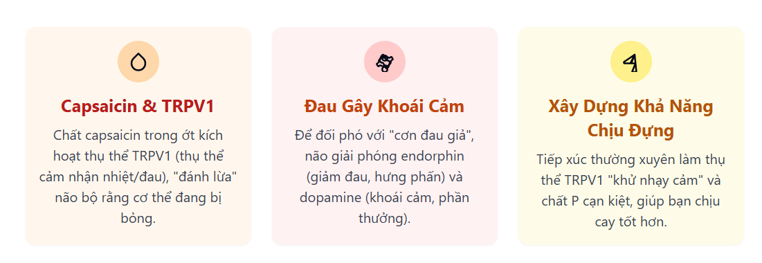 Vị cay không phải vị giác mà là cảm giác đau do capsaicin kích hoạt thụ thể TRPV1. Não bộ phản ứng với “đau” bằng cách giải phóng endorphin và dopamine, tạo cảm giác hưng phấn. Sự lặp lại cảm giác “đau-khoái cảm” này dẫn đến thói quen và “nghiện” ăn cay, một dạng “khổ dâm lành tính”. Cơ thể xây dựng khả năng chịu đựng cay thông qua việc “khử nhạy cảm” thụ thể và cạn kiệt chất P. Ăn cay có nhiều lợi ích sức khỏe như giảm cân, cải thiện tim mạch, giảm đau, nhưng cần ăn đúng cách để tránh tác hại.