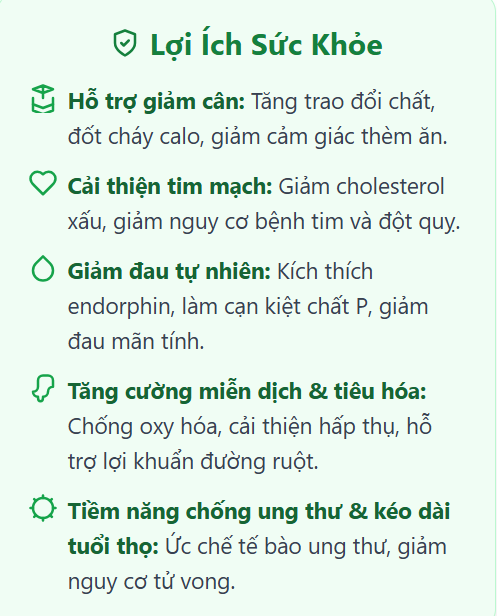 Một trong những lợi ích nổi bật của capsaicin là khả năng hỗ trợ giảm cân và tăng cường trao đổi chất. Hợp chất này có thể tăng cường quá trình trao đổi chất, giúp cơ thể đốt cháy nhiều calo hơn cả khi nghỉ ngơi và tập thể dục. Một số nghiên cứu đã chỉ ra rằng capsaicin có thể tăng tỷ lệ trao đổi chất lên tới 5%. Quá trình này, được gọi là sinh nhiệt, là cơ chế cơ thể đốt cháy năng lượng để tạo ra nhiệt.