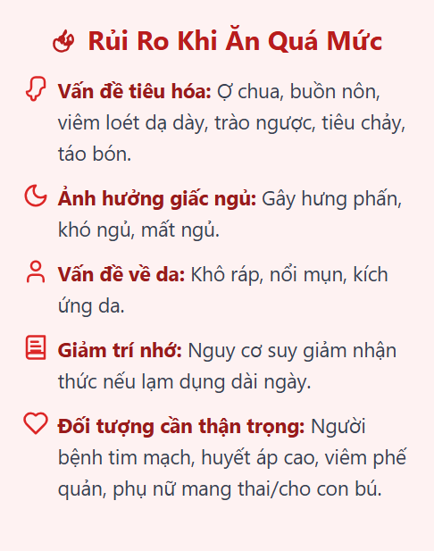 Việc lạm dụng thức ăn cay không chỉ ảnh hưởng đến hệ tiêu hóa mà còn có tác động toàn thân, bao gồm cả giấc ngủ và làn da. Ăn cay làm cơ thể phải sinh nhiệt, gây cảm giác khó chịu. Bên cạnh đó, tính cay nồng mạnh của ớt còn gây hưng phấn cao nếu ăn trước giờ đi ngủ, khiến hệ thần kinh bị kích thích và dễ gây mất ngủ trong thời gian dài. Các triệu chứng như ợ nóng, đau dạ dày do ăn cay quá mức cũng làm giấc ngủ trở nên kém hơn, khó sâu giấc hơn.