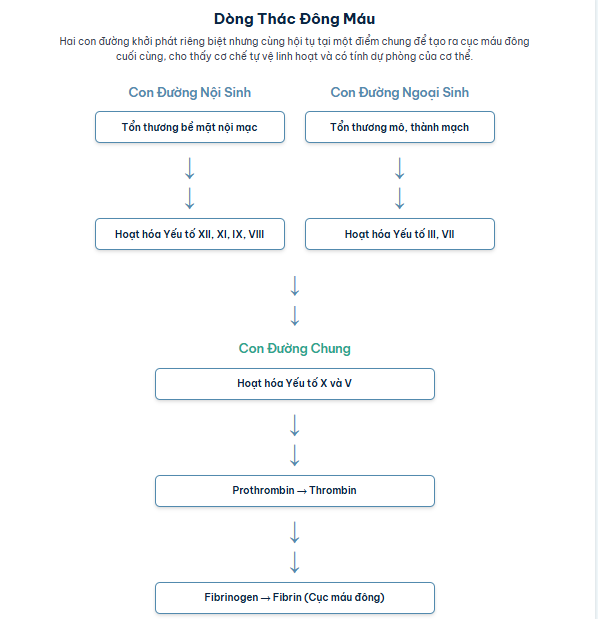 Sự tồn tại của hai con đường khởi phát riêng biệt nhưng cùng dẫn đến một con đường chung cho thấy một cơ chế tự vệ linh hoạt và có tính dự phòng của cơ thể. Con đường ngoại sinh cung cấp phản ứng nhanh chóng để cầm máu ban đầu sau chấn thương nghiêm trọng, trong khi con đường nội sinh giúp khuếch đại và duy trì quá trình đông máu, đảm bảo cục máu đông đủ mạnh và bền vững để cầm máu hoàn toàn.7 Điều này tối ưu hóa khả năng cầm máu trong nhiều tình huống khác nhau, cho thấy sự thông minh trong thiết kế sinh học của cơ thể để đối phó với mọi loại tổn thương.