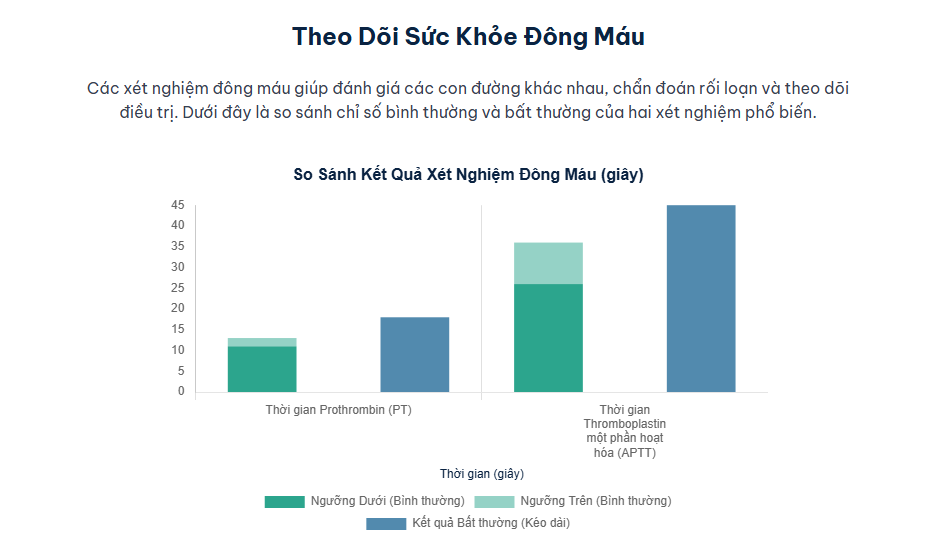 | APTT (Activated Partial Thromboplastin Time) | Con đường đông máu nội sinh và con đường chung. | 26-36 giây. | Bệnh máu khó đông (thiếu yếu tố VIII, IX, XI, XII); dùng Heparin; bệnh gan; DIC. | Chảy máu cấp; ung thư giai đoạn nặng; tăng đông máu; giai đoạn sớm DIC. |