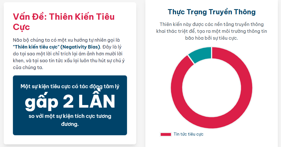 Đáng chú ý, các nghiên cứu cho thấy tin tức tiêu cực có sức hấp dẫn và thu hút sự chú ý của độc giả hơn. Điều này dẫn đến một thực tế đáng buồn là khoảng 90% tin tức được xem là tiêu cực, tạo ra một môi trường thông tin bão hòa bởi những nội dung có hại cho sức khỏe tinh thần.