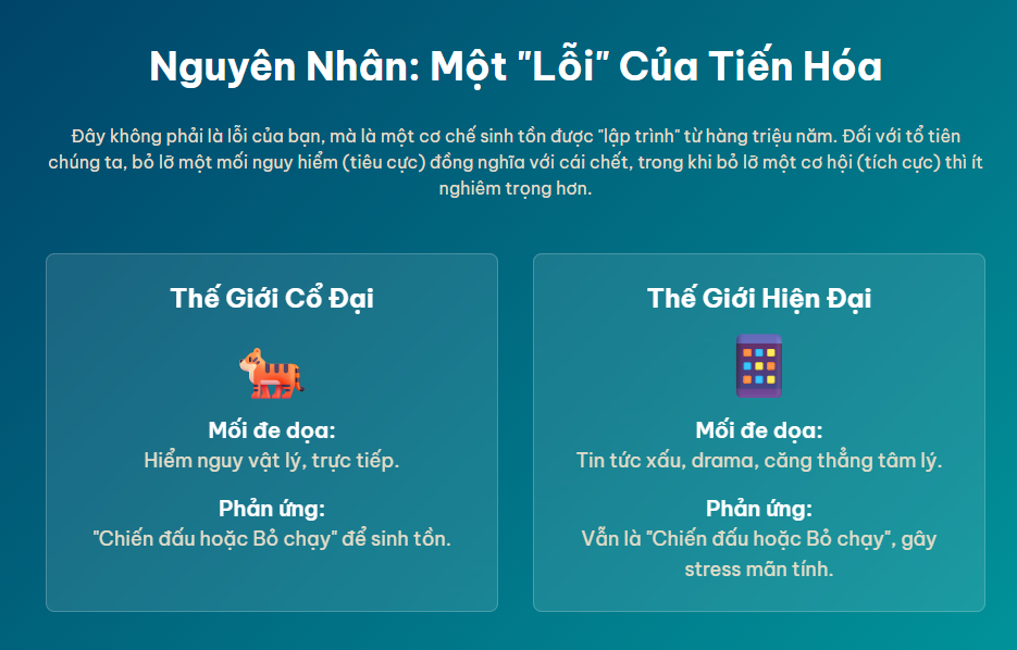 Thiên kiến tiêu cực không phải là một “lỗi” ngẫu nhiên mà là một cơ chế sinh tồn được phát triển qua hàng triệu năm tiến hóa của loài người. Trong môi trường nguyên thủy, tổ tiên chúng ta luôn phải đối mặt với vô vàn mối đe dọa trực tiếp đến tính mạng như động vật ăn thịt, thời tiết khắc nghiệt, hay các bộ lạc đối địch.