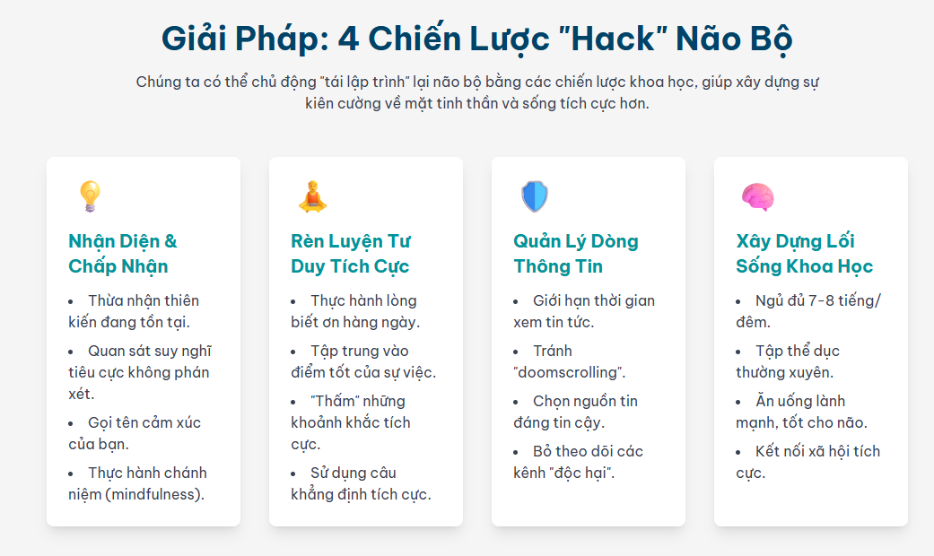 Phần này tổng hợp nhiều yếu tố lối sống khác nhau. Mặc dù mỗi yếu tố đều có lợi riêng, tác động tổng thể của chúng lớn hơn tổng các phần. Chúng không trực tiếp “hack” thiên kiến tiêu cực mà thay vào đó tạo ra một môi trường não bộ kiên cường ít bị ảnh hưởng bởi những tác động bất lợi của nó. Một bộ não khỏe mạnh sẽ được trang bị tốt hơn để điều hòa cảm xúc, xử lý thông tin một cách khách quan và phục hồi sau căng thẳng. Vượt qua sự “nghiện” tin tức tiêu cực không chỉ là một cuộc chiến nhận thức; đó là việc xây dựng một nền tảng vững chắc cho sức khỏe não bộ tổng thể. Khi não bộ được nghỉ ngơi đầy đủ, được nuôi dưỡng tốt và được kích thích, vỏ não trước trán (chịu trách nhiệm về lý luận logic và điều hòa cảm xúc) có thể ghi đè tốt hơn các phản ứng sợ hãi tự động của hạch hạnh nhân. Điều này làm cho việc “hack” trở nên bền vững và hiệu quả hơn. Người biên tập Những điều thú vị chấm com đã tổng hợp thông tin này để giúp độc giả xây dựng một cuộc sống khỏe mạnh và khoa học hơn.
