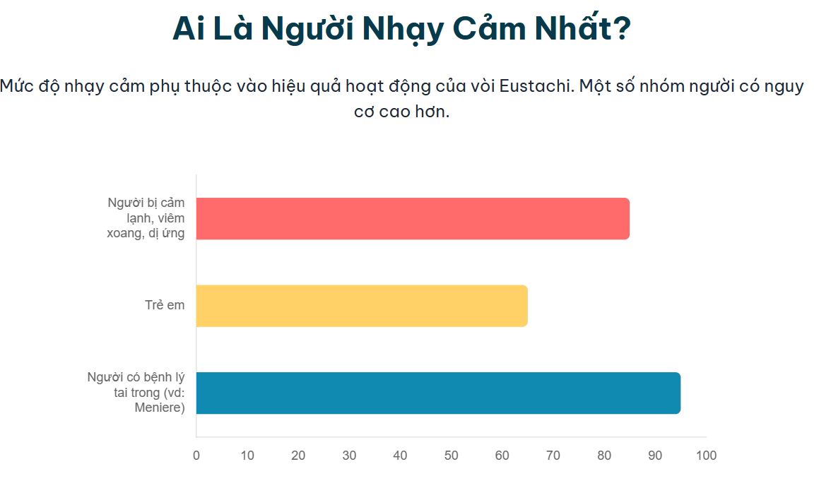 - Trẻ em: Vòi Eustachi của trẻ nhỏ có cấu trúc chưa hoàn thiện, thường ngắn hơn, hẹp hơn và nằm ngang hơn so với người lớn. Cấu trúc này khiến vi khuẩn dễ xâm nhập và dịch khó thoát ra ngoài, làm trẻ dễ bị viêm tai giữa và nhạy cảm hơn với thay đổi áp suất.10