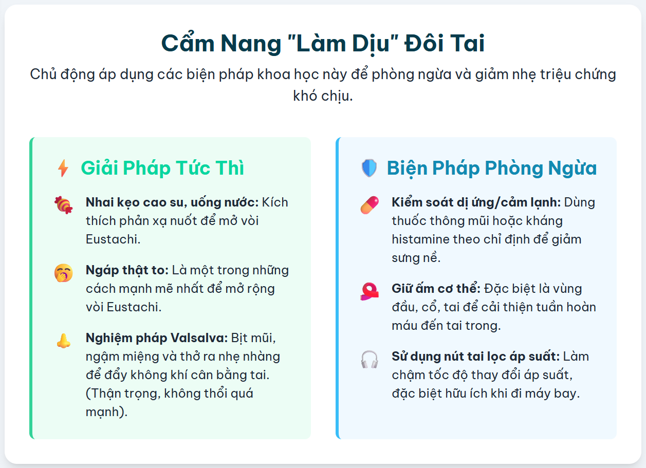 Nhai kẹo cao su / Ngậm kẹo / Uống nước | Kích thích phản xạ nuốt, giúp cơ mở vòi Eustachi một cách tự nhiên. | Khi bắt đầu cảm thấy tai đầy, ù. Trong suốt quá trình máy bay cất và hạ cánh. | Rất an toàn và hiệu quả cho các thay đổi áp suất nhẹ đến trung bình. |