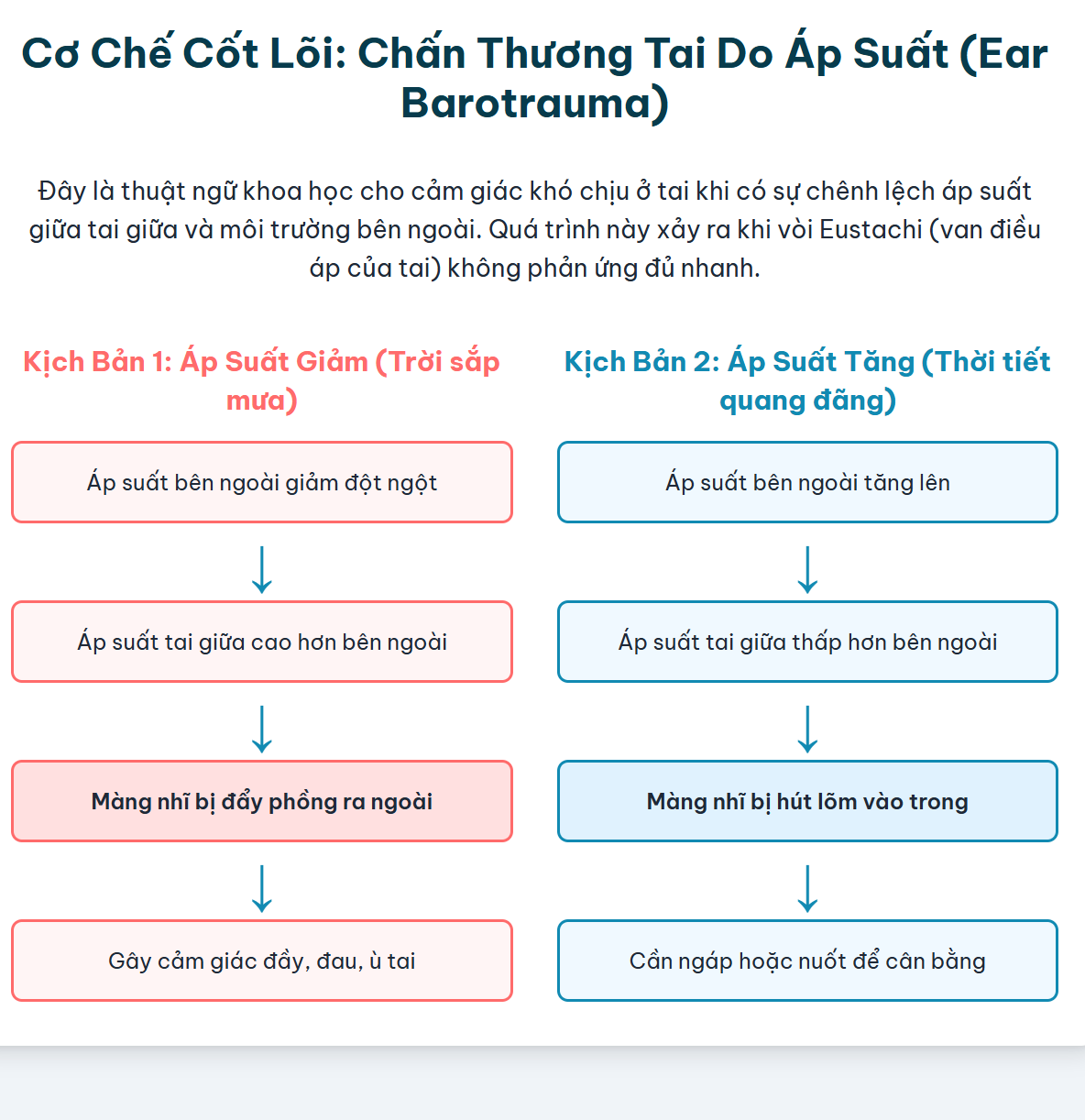 Có thể hình dung vòi Eustachi như một chiếc van điều áp tự động của cơ thể. Hiệu quả hoạt động của chiếc van này quyết định mức độ nhạy cảm của bạn với sự thay đổi thời tiết. Nếu chiếc van này hoạt động hoàn hảo, nó sẽ mở ra ngay lập tức để cân bằng áp suất và bạn sẽ không cảm thấy gì. Tuy nhiên, nếu nó bị “kẹt” hoặc hoạt động kém hiệu quả do viêm nhiễm, dị ứng, một khoảng chênh lệch áp suất sẽ hình thành, và đó là lúc các triệu chứng bắt đầu xuất hiện.