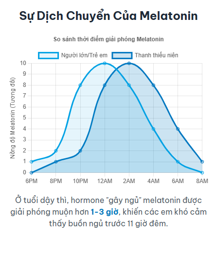 Xu hướng thức khuya của thanh thiếu niên không phải là dấu hiệu của sự “hư hỏng” hay thiếu kỷ luật, mà là một hiện tượng có cơ sở khoa học vững chắc, bắt nguồn từ những thay đổi sinh học tự nhiên trong giai đoạn dậy thì, đặc biệt là sự chậm trễ trong việc giải phóng hormone melatonin. Điều này dẫn đến hiện tượng trễ pha giấc ngủ, khiến các em khó đi vào giấc ngủ sớm và khó thức dậy vào buổi sáng.