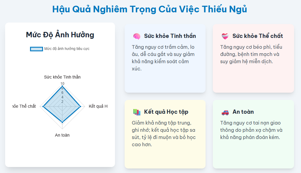 - Thiếu ngủ ảnh hưởng nghiêm trọng đến sức khỏe thể chất, tinh thần và học tập.