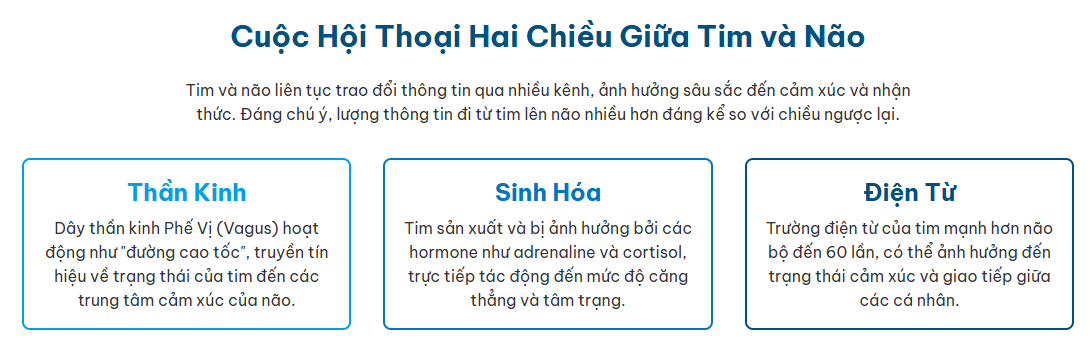 Thần Kinh (Dây Thần Kinh Phế Vị) | “Đường cao tốc” truyền tín hiệu điện giữa tim và não. | Chủ yếu từ tim lên não (hơn não xuống tim). | Điều hòa cảm xúc, phản ứng căng thẳng, khả năng tự điều chỉnh, trí nhớ, ra quyết định. |