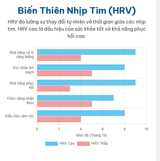Giảm căng thẳng & phục hồi | Giảm mức độ căng thẳng, tăng khả năng phục hồi sau áp lực. | HRV cao cho thấy khả năng xử lý căng thẳng tốt; gắn kết tim giúp cơ thể hoạt động hiệu quả và hài hòa. |