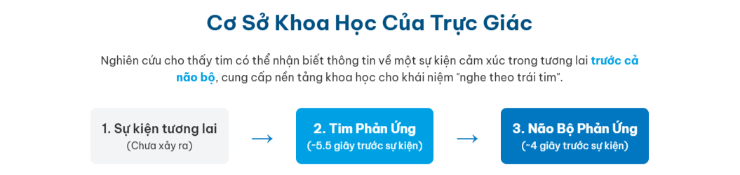 Nghiên cứu của Viện HeartMath đã đi sâu vào cơ chế sinh lý mà qua đó hoạt động của tim ảnh hưởng đến nhận thức, cảm xúc và trực giác của chúng ta. Một trong những phát hiện đáng kinh ngạc nhất là trái tim có khả năng nhận và xử lý thông tin về một sự kiện trong tương lai trước khi nó thực sự xảy ra. Cụ thể, các nghiên cứu đã chỉ ra rằng cả não bộ (qua EEG) và nhịp tim (qua ECG) đều nhận được thông tin tiền kích thích (pre-stimulus information) từ 4 đến 5 giây trước khi một hình ảnh cảm xúc trong tương lai được chọn ngẫu nhiên. Điều đặc biệt hơn là tim nhận được thông tin này sớm hơn não khoảng 1.5 giây.