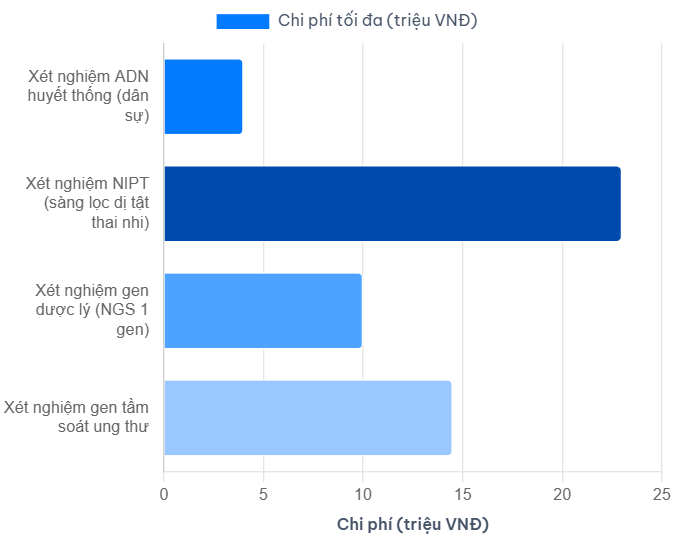 Ví dụ, một xét nghiệm ADN huyết thống dân sự có thể có giá từ 2.5 triệu VNĐ, nhưng các gói xét nghiệm sàng lọc ung thư hoặc phân tích gen tổng quát có thể lên tới 14.5 triệu VNĐ, hoặc thậm chí hơn 20 triệu VNĐ cho xét nghiệm NIPT trước sinh. Xét nghiệm gen chuyển hóa thuốc cụ thể như Thrombophilia có giá khoảng 2 triệu VNĐ/người, trong khi giải trình tự một gen đơn lẻ có thể lên tới 8-10 triệu VNĐ.