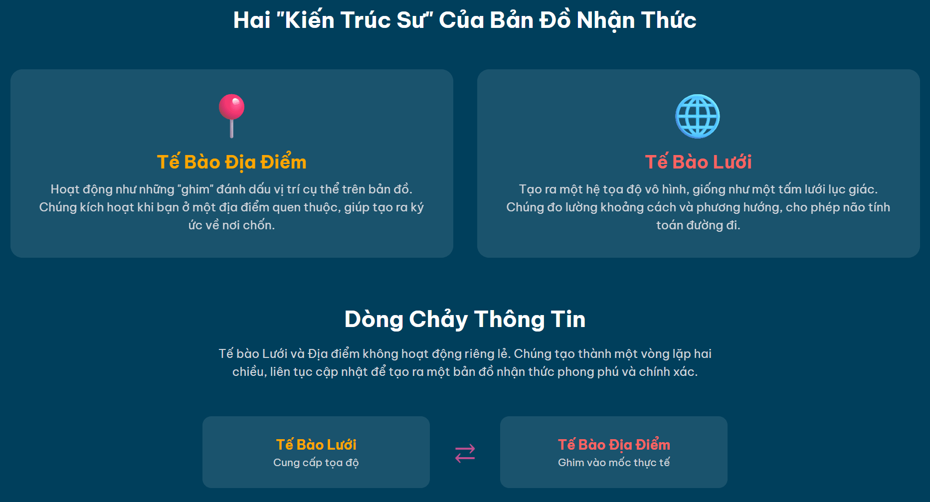Hai hệ thống này không hoạt động độc lập mà phối hợp chặt chẽ trong một vòng lặp thông tin hai chiều.14 Tế bào lưới từ vỏ não khứu giác trong cung cấp một hệ tọa độ hình học cho các tế bào địa điểm ở hồi hải mã. Ngược lại, các tế bào địa điểm, vốn được gắn với các đặc điểm cảm quan cụ thể của môi trường (một cái cây, một tòa nhà), giúp “neo” tấm lưới tọa độ vô hình này vào thế giới thực.12