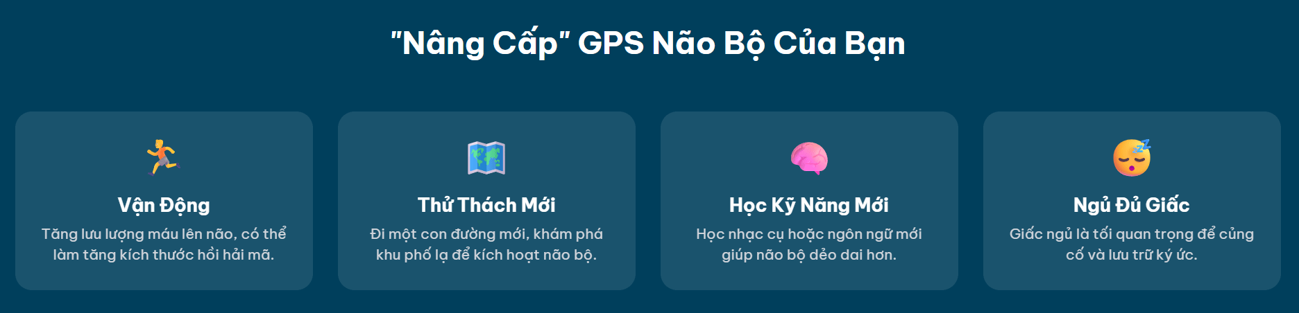 Tin tốt là, giống như cơ bắp, hệ thống GPS của não bộ có thể được rèn luyện và cải thiện. Việc “nâng cấp” này không chỉ dựa vào các “bài tập cho não” mà còn là một quá trình toàn diện, kết hợp giữa việc thử thách tinh thần và xây dựng các thói quen sống lành mạnh.