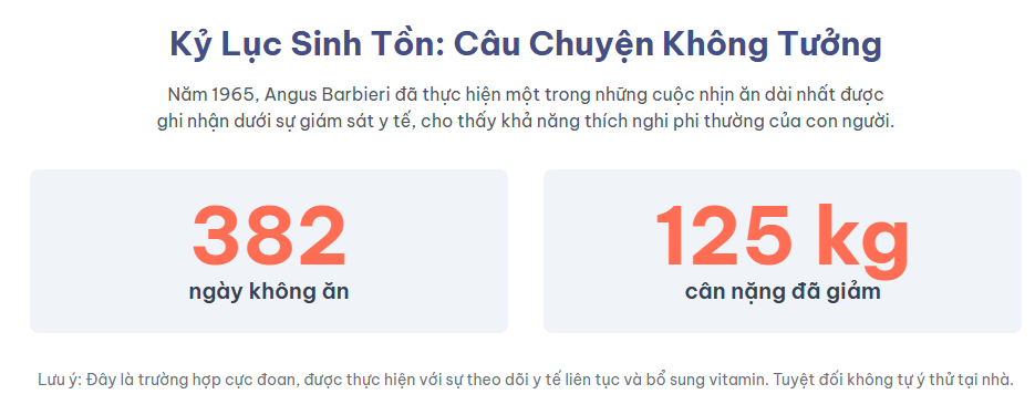 Vào tháng 6 năm 1965, một người đàn ông Scotland tên Angus Barbieri, ở tuổi 27 và nặng hơn 200kg, đã quyết định thực hiện một cuộc nhịn ăn kéo dài tại Bệnh viện Hoàng gia Dundee để giảm cân. Ban đầu, Angus chỉ dự định nhịn ăn khoảng 40 ngày, đây là thời gian nhịn ăn dài nhất được khuyến nghị y tế vào thời điểm đó. Tuy nhiên, điều đáng kinh ngạc là cơ thể anh đã thích nghi một cách đáng ngạc nhiên, và Angus quyết định tiếp tục quá trình nhịn ăn dưới sự giám sát y tế nghiêm ngặt.