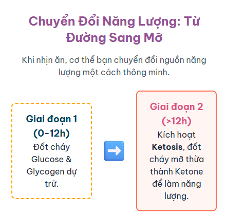 - Cơ thể chuyển hóa từ đường sang chất béo khi nhịn đói, tạo ketone cung cấp năng lượng.