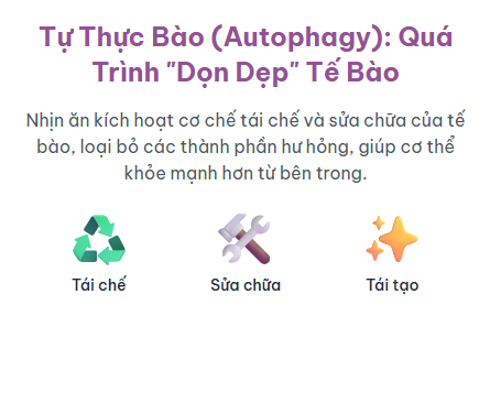 - Tự thực bào giúp “dọn dẹp” tế bào hư hỏng, tăng cường sức khỏe tổng thể.