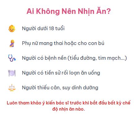 Để đảm bảo an toàn, một số đối tượng không thích hợp với phương pháp nhịn ăn gián đoạn và cần tránh hoặc tham khảo ý kiến bác sĩ trước khi thực hiện: