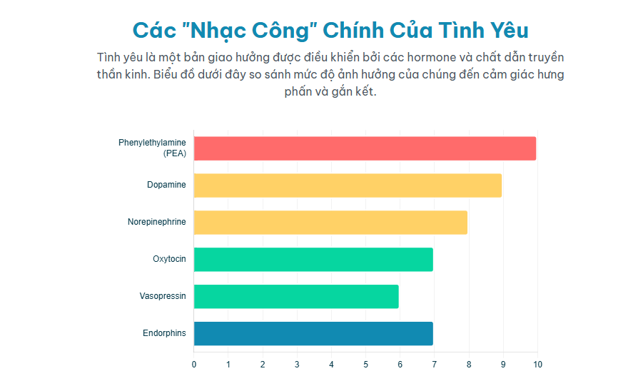 Tình yêu không phải là một cảm xúc đơn lẻ mà là sự hòa quyện của nhiều chất hóa học thần kinh (neurochemicals) và hormone khác nhau, mỗi chất đóng một vai trò riêng biệt trong việc định hình trải nghiệm cảm xúc và hành vi của chúng ta khi yêu. Các “nhạc công” chính trong bản giao hưởng hóa học này bao gồm: