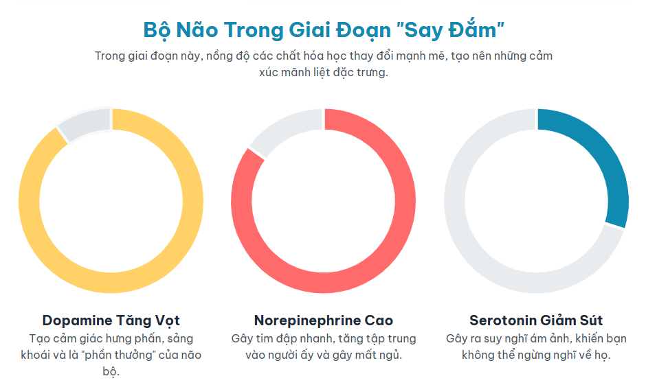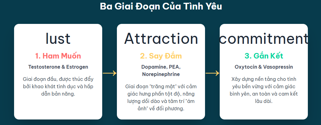 2. Say đắm (Attraction) | Dopamine, Norepinephrine, Phenylethylamine (PEA), Serotonin (giảm) | Hưng phấn tột độ, năng lượng dồi dào, tập trung ám ảnh vào đối phương, mất ngủ, chán ăn. |
