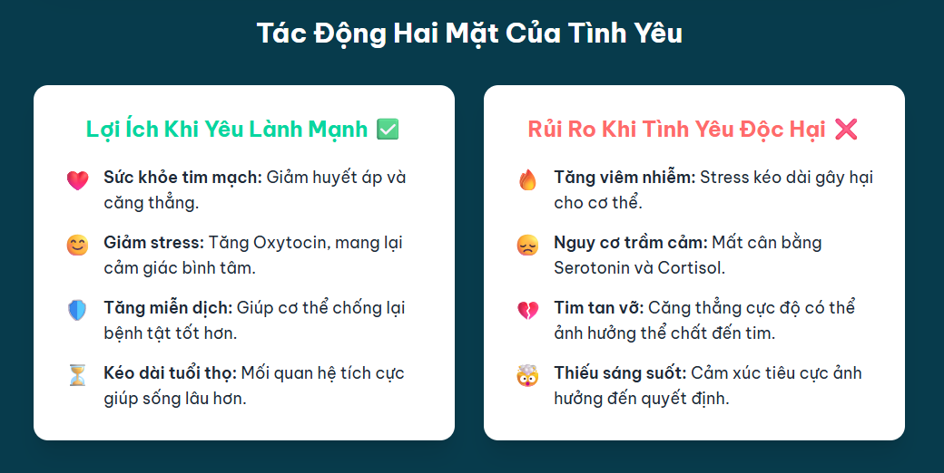Những tác động đối lập này cho thấy rằng không phải mọi tình yêu đều có lợi cho sức khỏe. Sức khỏe của một người trong tình yêu phụ thuộc rất nhiều vào việc mối quan hệ đó có lành mạnh, được đáp lại và mang lại cảm giác an toàn, hạnh phúc hay không. Mối quan hệ tích cực sẽ thúc đẩy các hormone hạnh phúc và hệ thống phần thưởng của não bộ, trong khi tình yêu đơn phương hoặc độc hại có thể kích hoạt phản ứng căng thẳng mãn tính, gây hại cho cơ thể về lâu dài. Điều này nhấn mạnh tầm quan trọng của việc nuôi dưỡng những mối quan hệ tích cực và biết cách đối phó với những cảm xúc tiêu cực để bảo vệ sức khỏe.