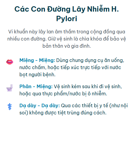 Tỷ lệ nhiễm H. pylori ở Việt Nam rất cao, ước tính lên tới hơn 80% dân số.19 Các con đường lây nhiễm chính bao gồm: