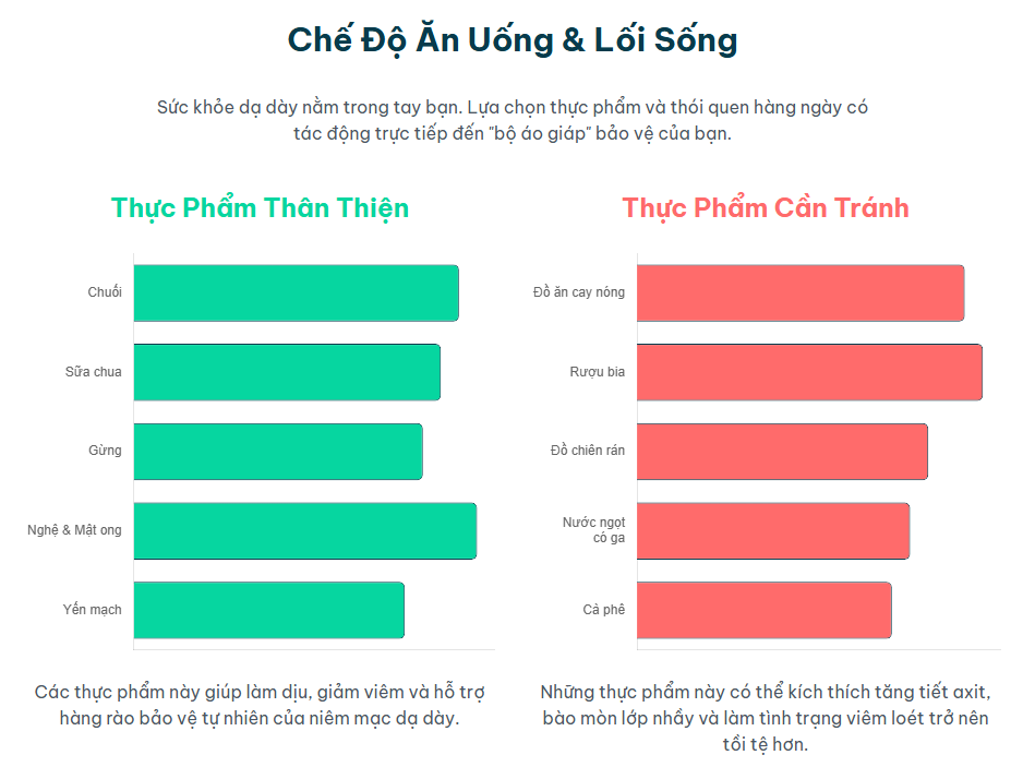 Đồ uống | Nước dừa tươi, nước ấm, trà thảo dược | Rượu bia, cà phê, nước ngọt có ga | Trung hòa axit, bổ sung điện giải, làm dịu; Kích thích tiết axit, bào mòn niêm mạc, gây đầy hơi |