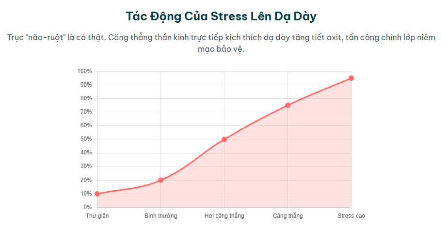 Nhiều nghiên cứu nhất quán chỉ ra căng thẳng là nguyên nhân chính hoặc yếu tố làm trầm trọng thêm các vấn đề về dạ dày, liên kết rõ ràng nó với việc tăng tiết axit và giảm lưu lượng máu. Điều này cho thấy một con đường sinh lý trực tiếp mà qua đó trạng thái tinh thần và cảm xúc (căng thẳng) tác động sâu sắc đến chức năng thể chất và sức khỏe của hệ tiêu hóa. Trục não-ruột rõ ràng đang hoạt động. Điều này có nghĩa là việc quản lý sức khỏe dạ dày không chỉ là về chế độ ăn uống hoặc thuốc men; nó cơ bản đòi hỏi phải giải quyết sức khỏe tâm lý. Các phương pháp tiếp cận sức khỏe toàn diện tích hợp các kỹ thuật giảm căng thẳng không chỉ là bổ sung mà còn là yếu tố cần thiết để ngăn ngừa và điều trị các bệnh về dạ dày, chuyển đổi quan điểm từ một cơ quan thuần túy vật lý sang một cơ quan gắn bó sâu sắc với hệ thần kinh và trạng thái tinh thần. Các biện pháp giảm căng thẳng hiệu quả bao gồm: Giải tỏa căng thẳng là cách tốt nhất để giảm đau dạ dày. Thực hành hít thở đều, thiền định, yoga, tạo thói quen nghỉ giải lao khi làm việc, và tìm kiếm sự giúp đỡ từ bạn bè hoặc chuyên gia tâm lý nếu cần.